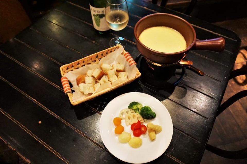The two mainstay menus are cheese fondue (from 700 yen), which combines several types of cheese to suit Japanese tastes, and fresh, fruity draft wine (800 yen per glass).
