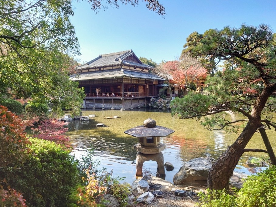 The main highlight of the park is the grand hall built to face the pond in order to provide a magnificent view. The use of pillars has been kept to a minimum so that visitors can fully take in the scenery. The roof of the main building is covered with Ichimonji tiles, which have a heavy, substantial feel and straight-edged bottoms. It is said that the architect went to considerable lengths to ensure that a limited number of pillars could support the great weight of the tiles.