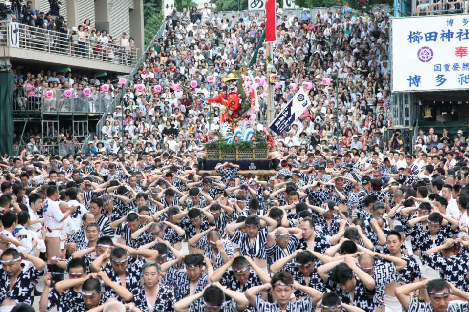 Hakata Gion Yamakasa centers around a dedication ritual to the god of the Kushida Shrine that takes place from the 1st to 15th of July every year. With a history of over 700 years, its origin goes back to 1241 when a plague swept through Hakata, and a monk named Shouichikokushi, who was the founding priest of the Shotenji Temple, sprinkled holy water to purify the city and keep the plague away (there are various theories for its origin).