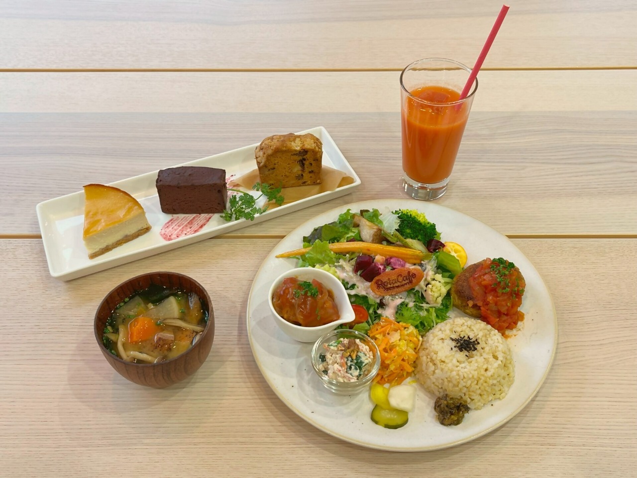Rota’s signature plate dishes feature a main dish that changes each week, and include tofu hamburger, cutlet of kuruma-fu (a type of wheat gluten cake), soy-meat chicken nanban (fried soy-meat chicken with vinegar and tartar sauce), and mixed-grain millet veggie fish, and are served with two side dishes, a colorful salad and brown rice. Taste is important, of course, and Rota also insists on an attractive presentation and satisfying volume.