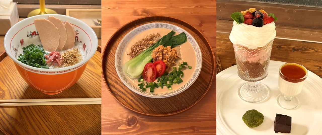 The soft, sticky ramen noodles are served in a rich soup. The chef is particularly confident about his gyoza, which he makes by hand the same way he makes it for his family. Customers say they’re the most delicious in Japan! And parfaits, cakes and other sweets are made with plenty of vegetable cream, showing that the there’s no need to use cream, butter or eggs to make truly delicious desserts.