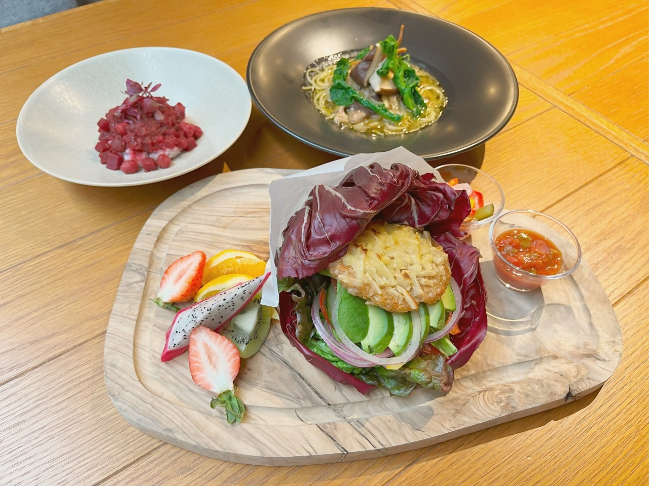 vegan dishes in each category, including appetizers, soups, and main dishes. The “10 kinds of Kyushu vegetable vegan burger” is available for takeout menu. Soy patties, which are handmade with plenty of vegetables such as lotus root and onions, and avocado are sandwiched between lettuce. It is colorful and extremely satisfying.