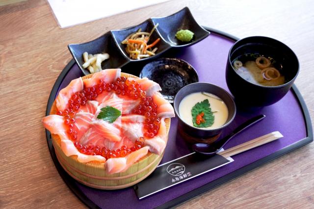 “Itoshima Kaisendo Futamigaura Honten” was made with a concept of offering seafood rice bowls right next to the sea. Many customers come here to try the superbly fresh fish while gazing out on the water.