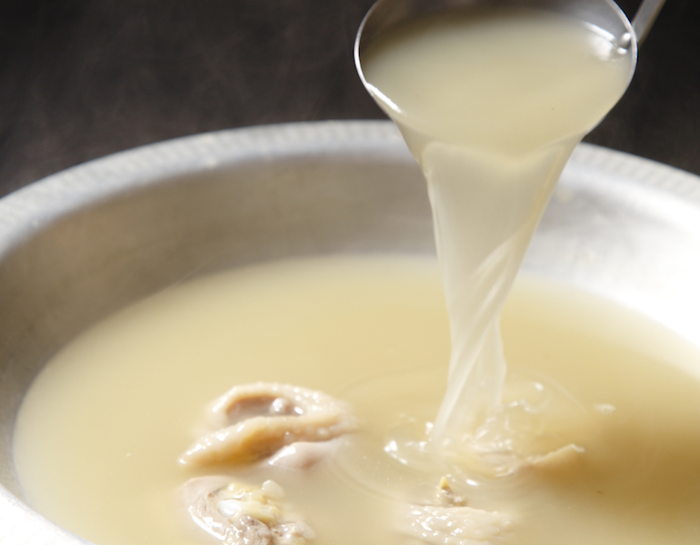 While the soup of Hakata Hanamidori was developed through trial and error, the key ingredient is the Hanamidori brand chicken raised at their poultry farm in northern Kyushu. In a spacious henhouse, bathed in sunshine, the chickens are kept in the cleanest conditions and eat a specially-developed feed. The fresh chicken carcass is slowly boiled in mineral water for four hours, and the scum is carefully hand-removed by their artisan cooks. Since the birth of this brand chicken in 1988, word of its deliciousness has reached the ears of new fans far and wide.