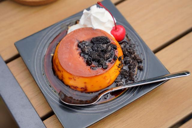 The Rich Homemade Steamed Pudding has a refreshing sweetness complemented by a slight bitterness in the caramel syrup coating it, giving it a mature flavor. Crushed chocolate cookies are scattered on top of the otherwise classic-style pudding, improving not only the flavor but the texture of the dessert as well.