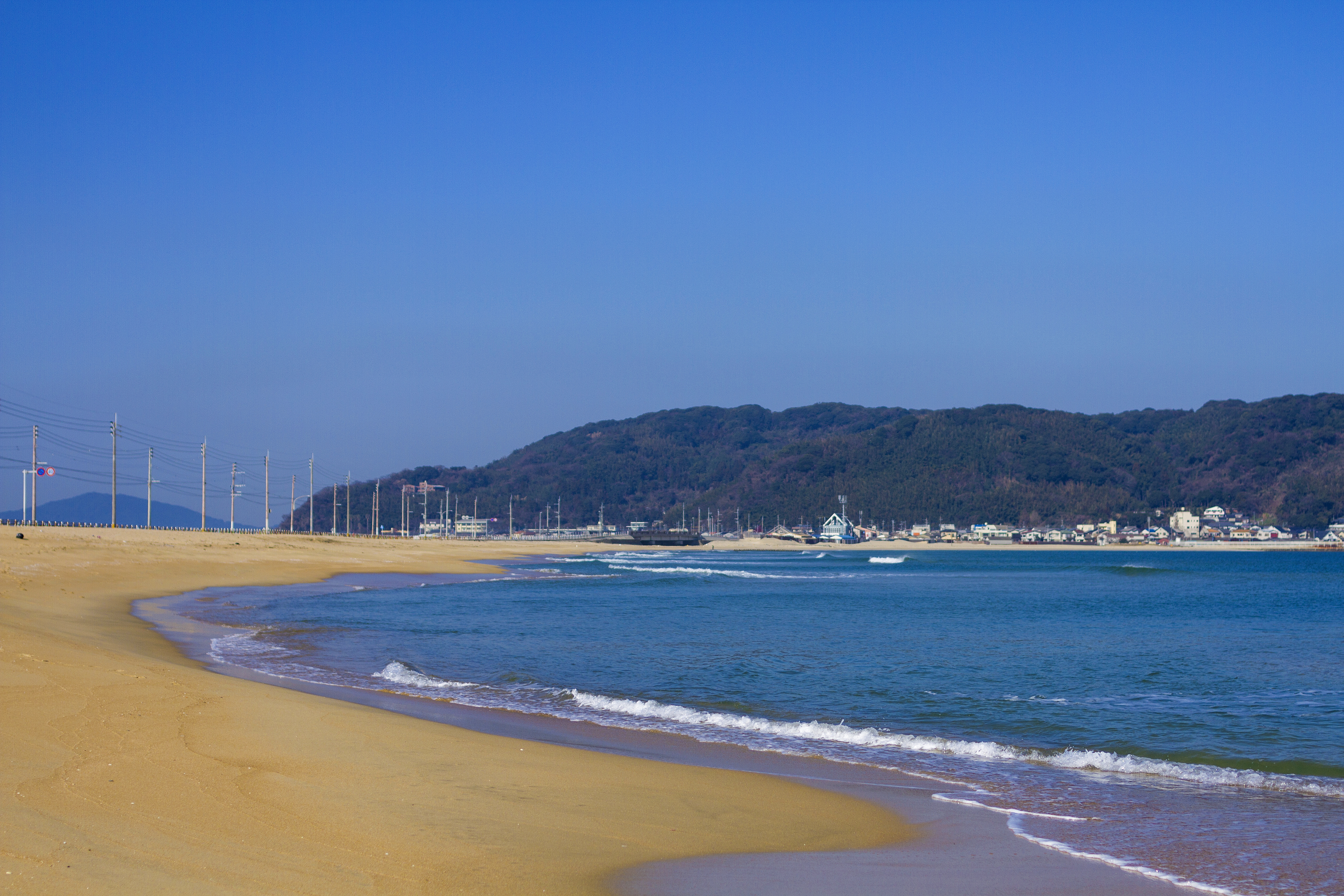 Shikanoshima beach overlooks Fukuoka Dome and Fukuoka Tower across the sea. The beach is provided with various facilities including seaside houses and toilets. A net is set up to keep out jelly fish from the swimming area. This is a popular spot for surfing.