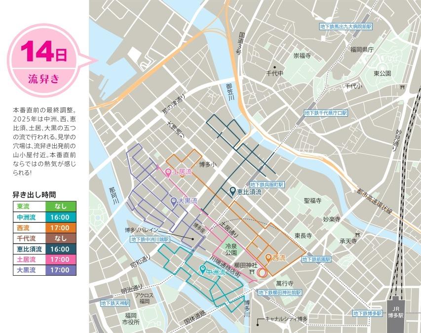 고후쿠마치 교차로에서 주오구 덴진에 위치한 후쿠오카 시청 앞까지 약 1.2킬로의 거리를 달립니다. 시장을 비롯한 지역 명사들이 가마 위에 오릅니다. 가는 길과 오는 길 모두 즐길 수 있습니다.