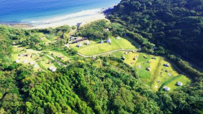 A glamping facility spreading in a vast area at Ushirohama Beach.