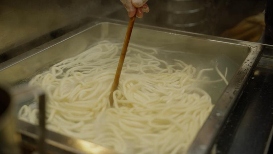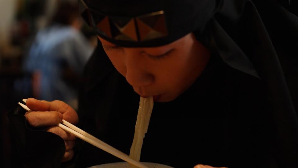 与浓郁拉面形成对比,乌龙面口味温和。忍者大口吃着软嫩乌龙面喝下清香汤头,享受美味。