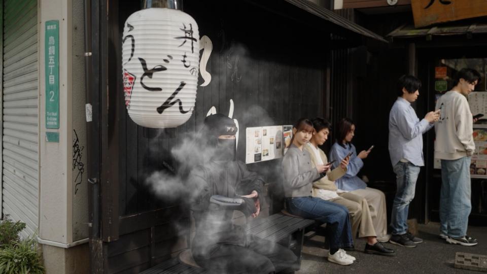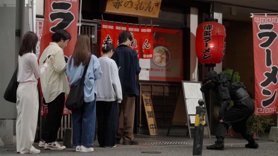 跟着忍者穿梭在城市间,突然在一间大排长龙的拉面店前停了下来。