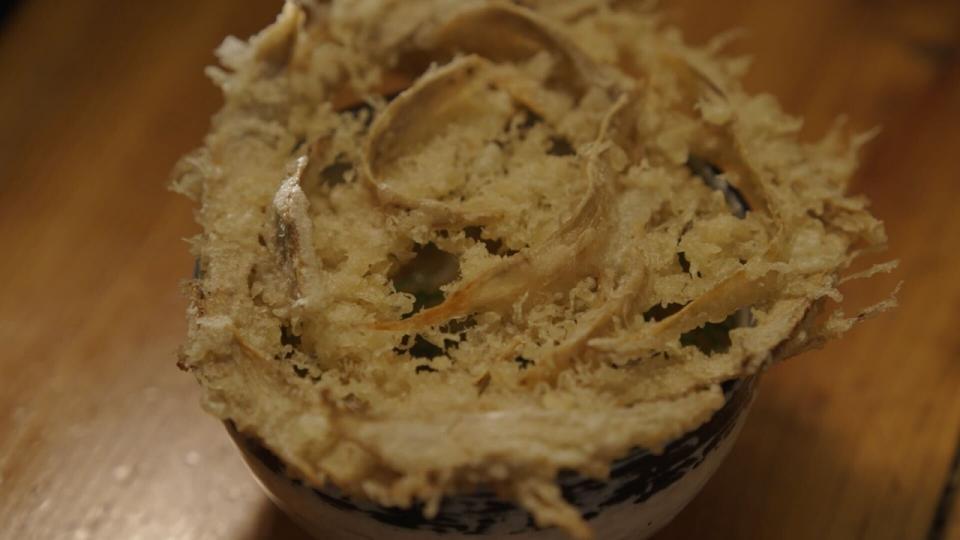 忍者点的是人气菜色「炸牛蒡乌龙面」。乌龙面上的现炸牛蒡天妇罗,香气四溢,浸泡在汤里更是美味提升。这碗乌龙面分量十足,温润汤头将所有食材完美融合。