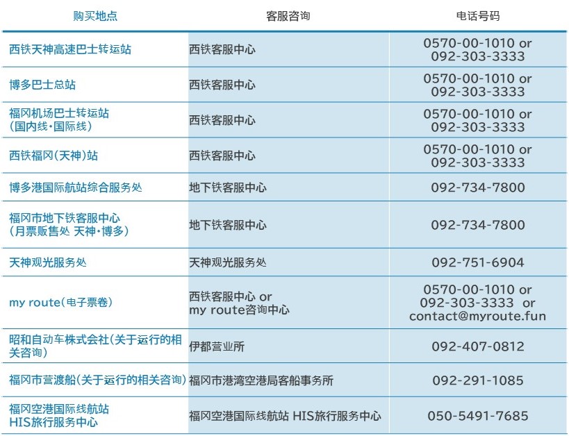 西铁天神高速巴士总站、博多巴士总站、福冈机场巴士乘车站、天神站旅客服务中心、巴士营业所 等