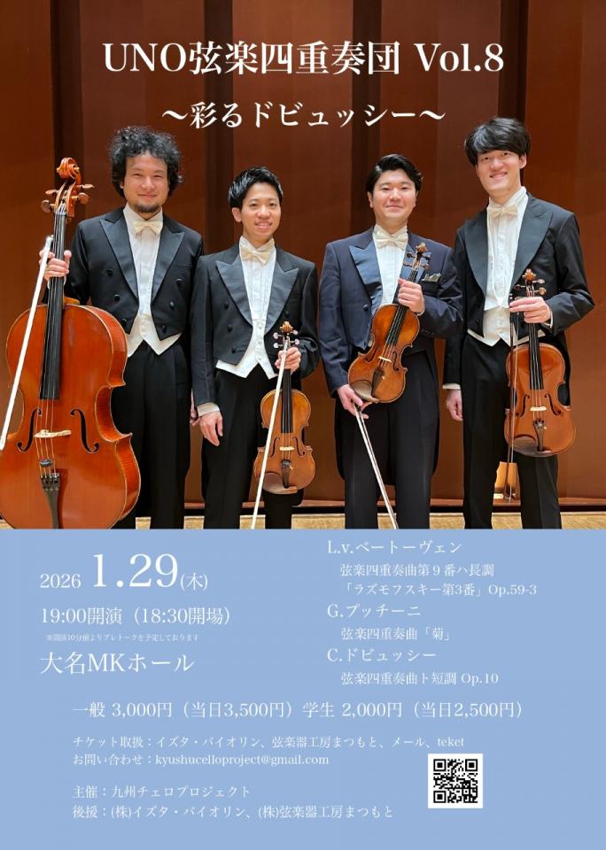以九州为据点的室内乐团「九州大提琴计画」主办、UNO弦乐四重奏团演出的人气系列第八弹,将于2026年1月登场。本次主题定为「缤纷德布西」,众多经典名曲将在冬夜里璀璨响起。