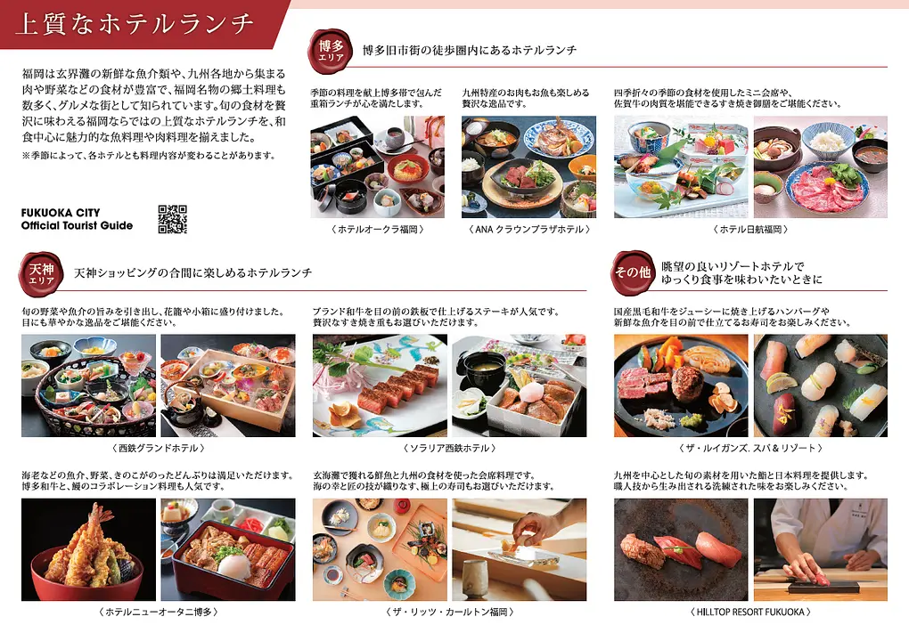 福岡擁有玄界灘的新鮮魚貝類,以及來自九州各地的肉類、蔬菜等豐富食材,還有許多使用福岡特產做的鄉土料理,更有美食之都的稱號。奢華享受當季食材的優質飯店午餐,以和食為主嚴選福岡特有的當季食材製作的魚料理和肉料理應有盡有。