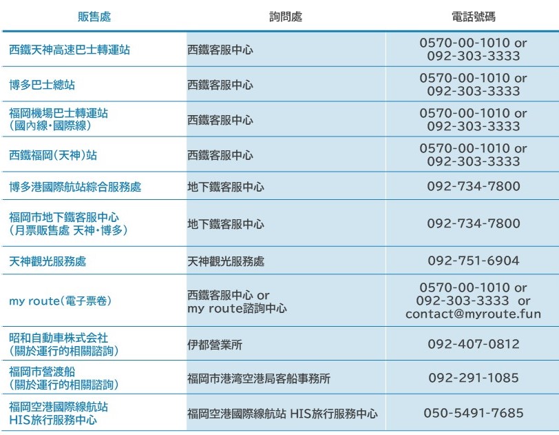 西鐵天神高速巴士總站、博多巴士總站、福岡機場巴士乘車站、天神站旅客服務中心、巴士營業所 等