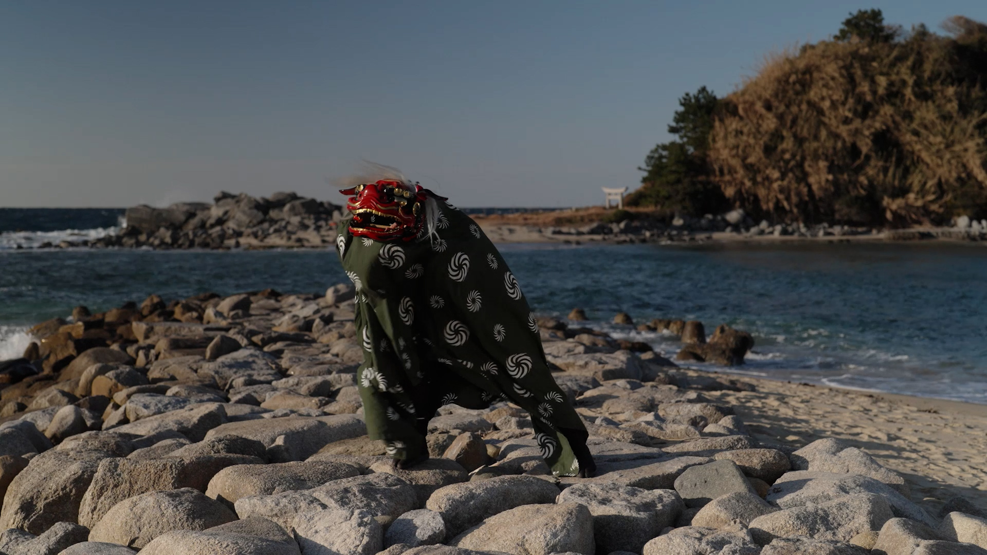 The Lion Dancer also gazed at the beautiful torii floating on the sea from afar, enjoying the sound of the waves for a while.
