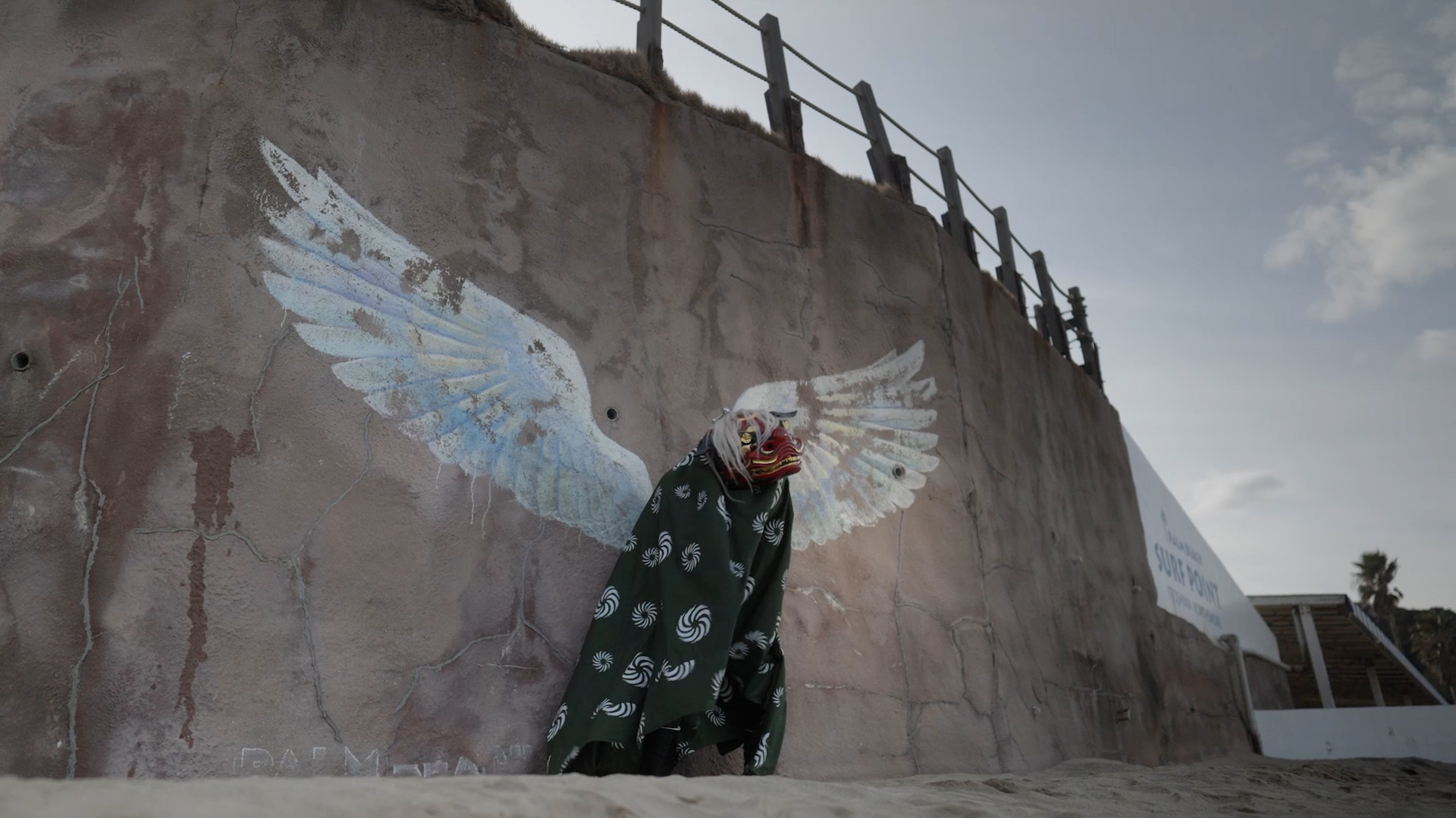 As the Lion Dancer listens to the waves, a crowd gathers across the beach. There, the 'Angel's Wings' wall art appears. The Lion Dancer, without thinking, strikes a pose in front of it.