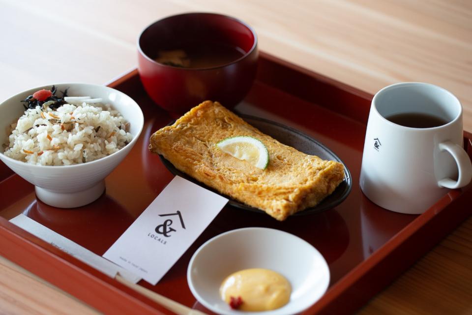 Nearby at Ohori Terrace, the Japanese-style café & LOCALS serves dishes made with Yame tea and Kyushu ingredients, including the popular Dashi Tamago-yaki Set - limited to 30 servings per day - featuring individually hand-grilled omelets made with dried sardine stock and fresh eggs, served with rice and miso soup. Their Dashi Tamago Sandwich is another favorite. On the ground floor, a retail market sells teas, snacks, seasonings, alcohol, and other food items for gifts and souvenirs.