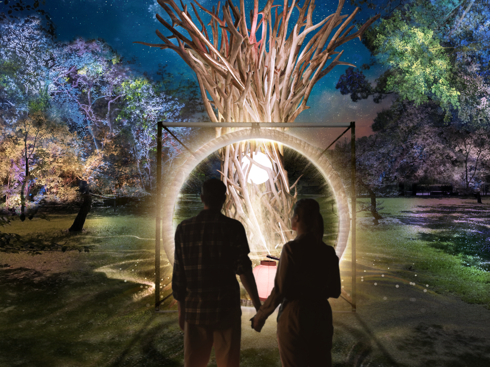 In the cherry blossom orchard, there is a holy tree, a gentle light emanating from the entrance to the garden. The glow that covers the entire area helps create this experiential digital art activity.