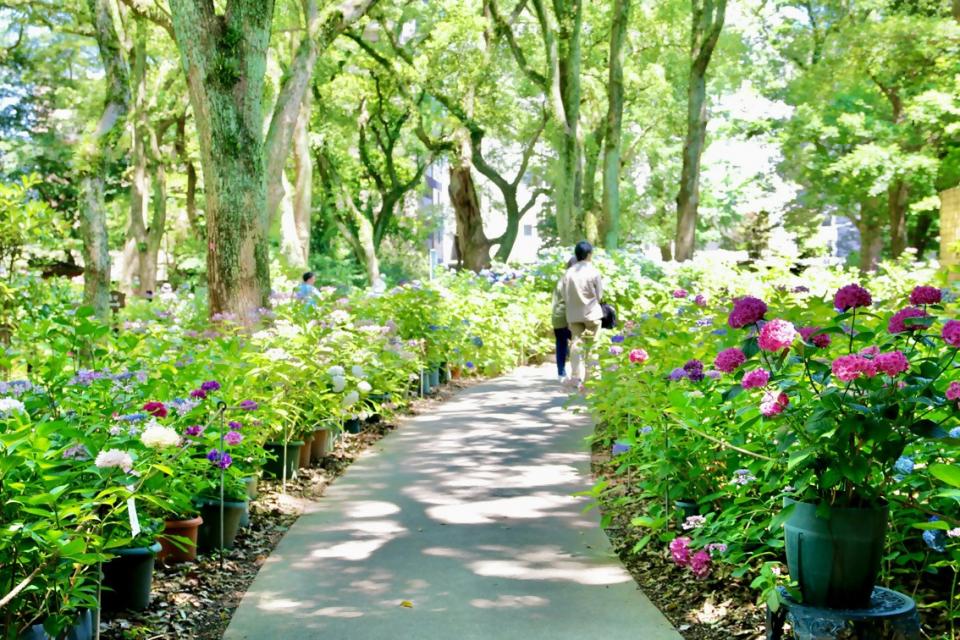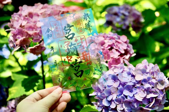 「紫阳花苑」是毎年6月左右限定期间开园的花园。约100种・3,500株紫阳花绽放、缤纷色彩的花朵让参拜的人们着迷。静谧的园内,被雨打湿的紫阳花更显娇艳美丽,这样的风景正是初夏的风情诗。近年来和限定的透明御朱印合照,成为社群网站的热门景点深受欢迎。入园门票300日圆。