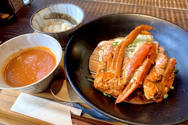 就在筥崎宫旁边的「筥崎鸠太郎商店」,改建古民家的和风摩登复古空间。午餐时段浓郁美味的梭子蟹沾面套餐(1,199日圆)最受欢迎。